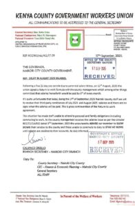 In a strongly worded letter dated September 17, 2025, addressed to Nairobi County Secretary Godfrey Akumali, KCGWU branch secretary Calvince Okello said the prolonged delay had left workers struggling to meet personal and family obligations.
